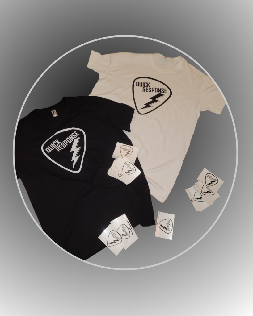 Wil je ook zo’n mooi QR shirt, of een stapel stickers? Vraag er dan naar voor of na ons optreden. Maten m/v (wit of zwart): S/M/L/XL/XXL
